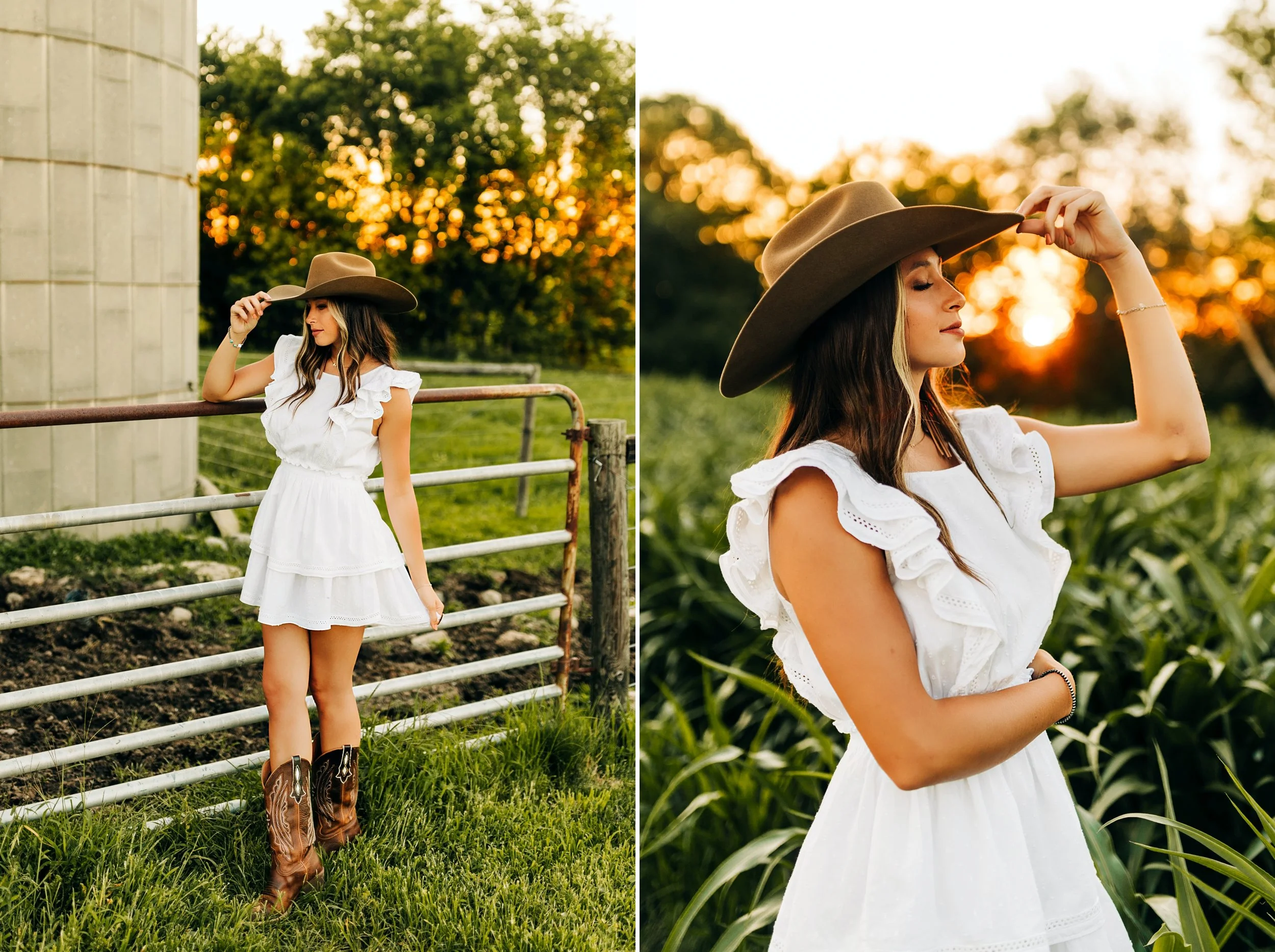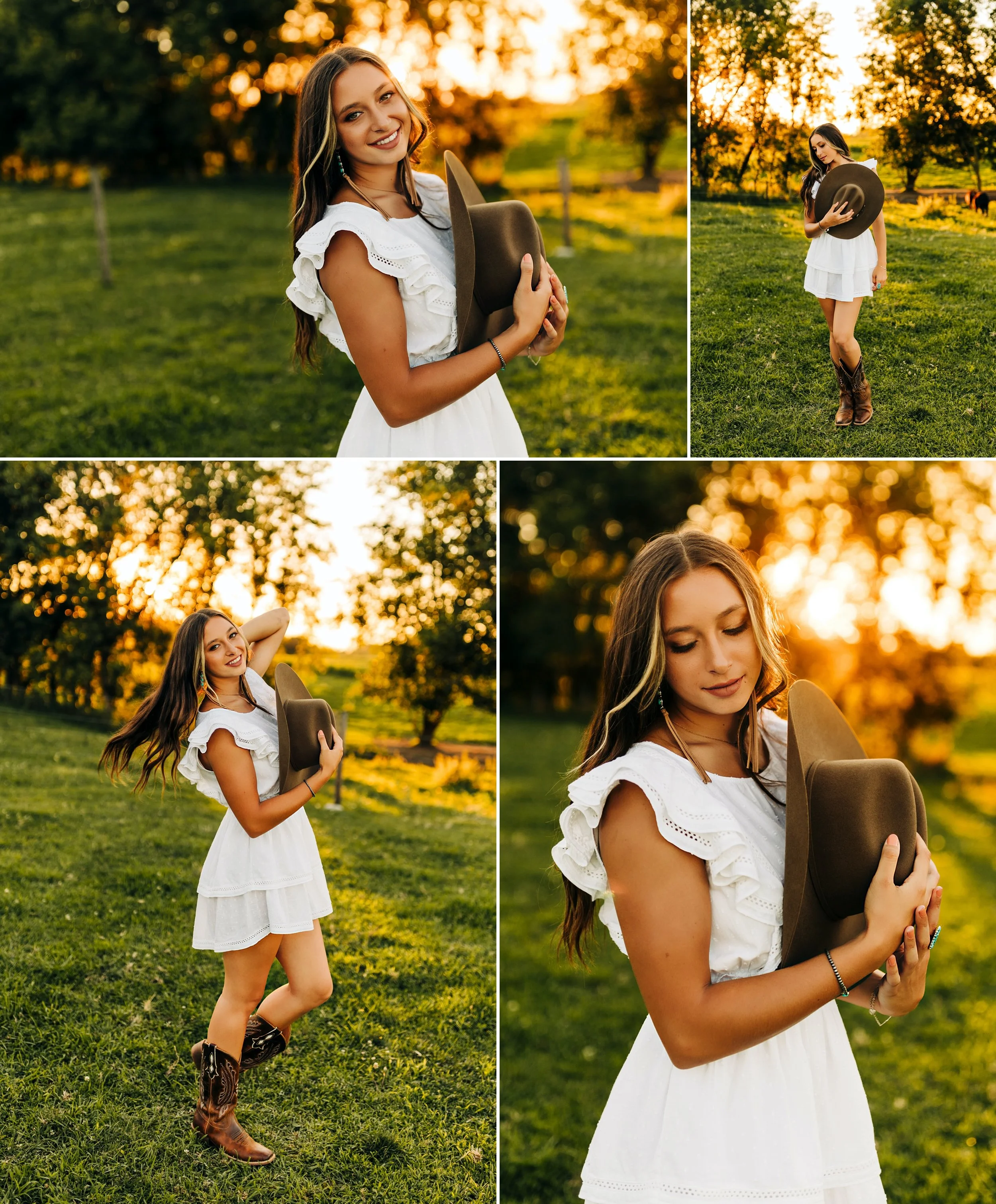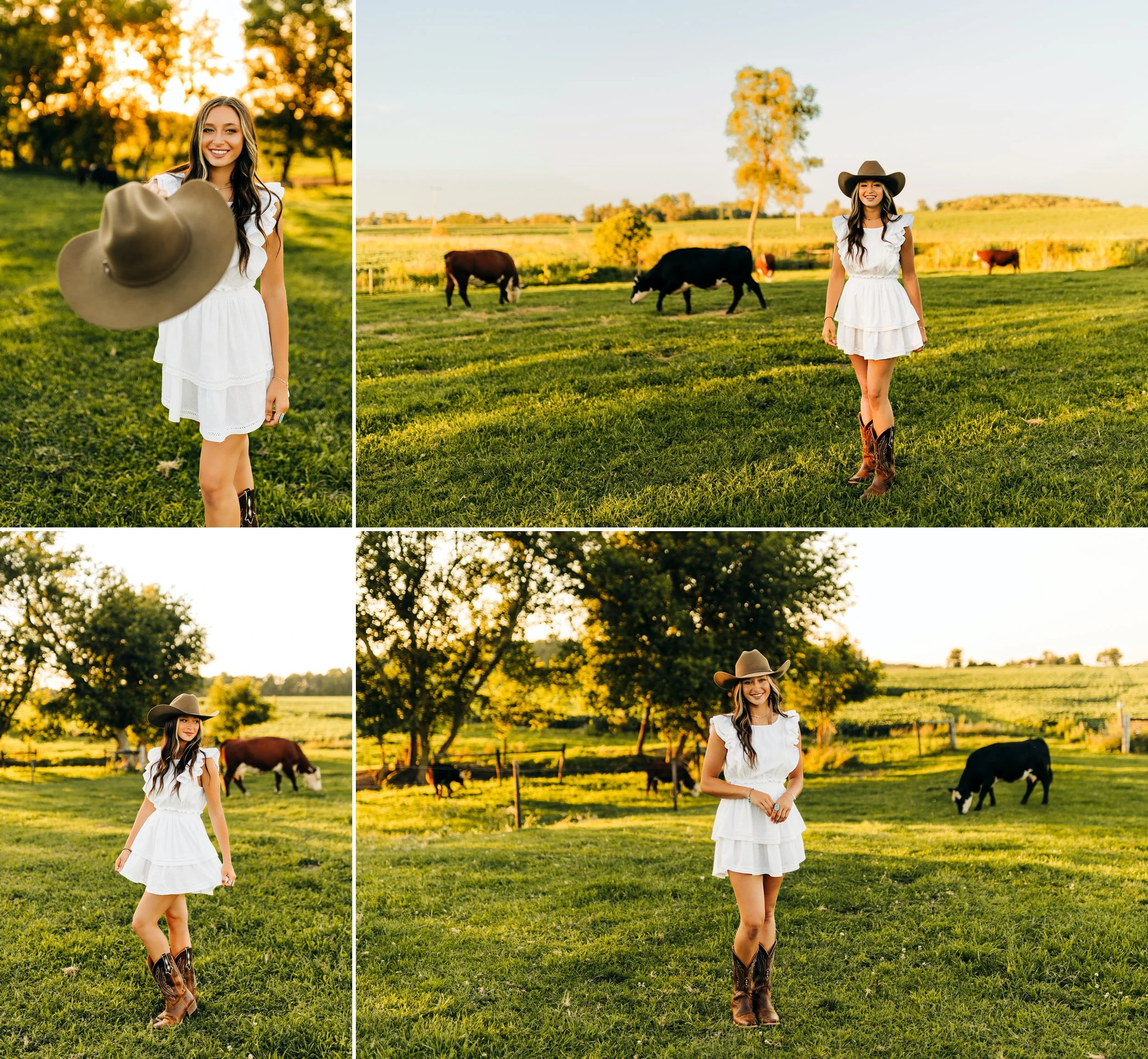 Then, we headed for the farm which was my favorite part of her session!! Her adorable cowboy boots, the white dress, and her cowboy hat were absolute perfection in the cow pasture! The cows were super interested in us and watched us the entire time, they were so funny! Everything fell into place so beautifully and we had a picture perfect golden hour.