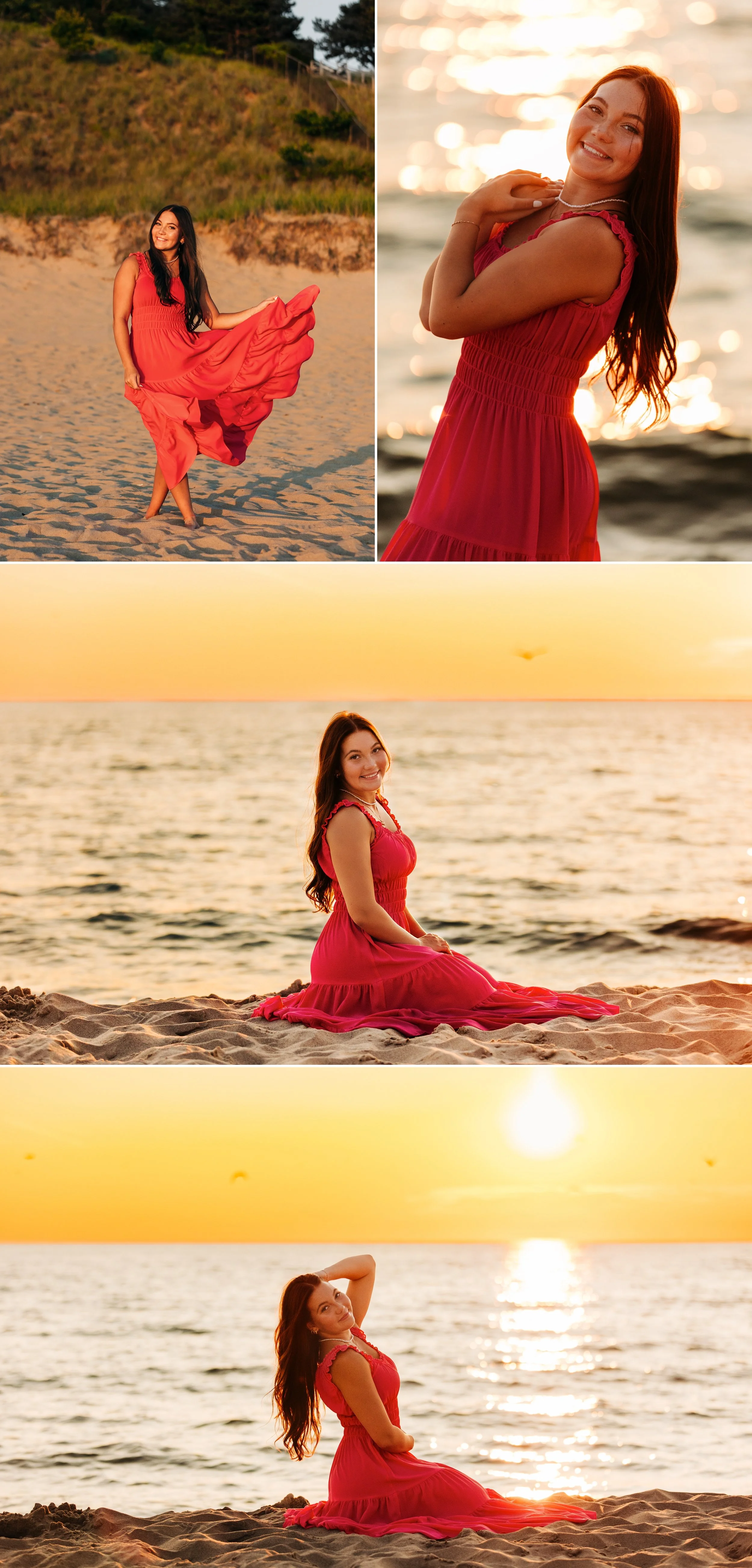 We started Ellieβs session at a gorgeous location with flower fields, a cute red barn, and a pretty wooden bridge. I absolutely LOVED Ellieβs overalls with her pink converse!! It was such a fun, adorable outfit! Afterwards, we headed to Holland for some gorgeous beach photos on Lake Michigan! All of Ellieβs outfits were perfect again, but I especially loved her pink dress! The color and movement of her dress with the colors of the sunset was incredible. Iβm so happy that Michigan gave her such a beautiful sunset while she was in town!! We had the perfect day for her senior session and it was SO much fun! It was so, so incredible of Ellie to travel across the country for her senior pictures with me. Iβm so happy she did because it was so lovely to meet her, we had such a fun time!!