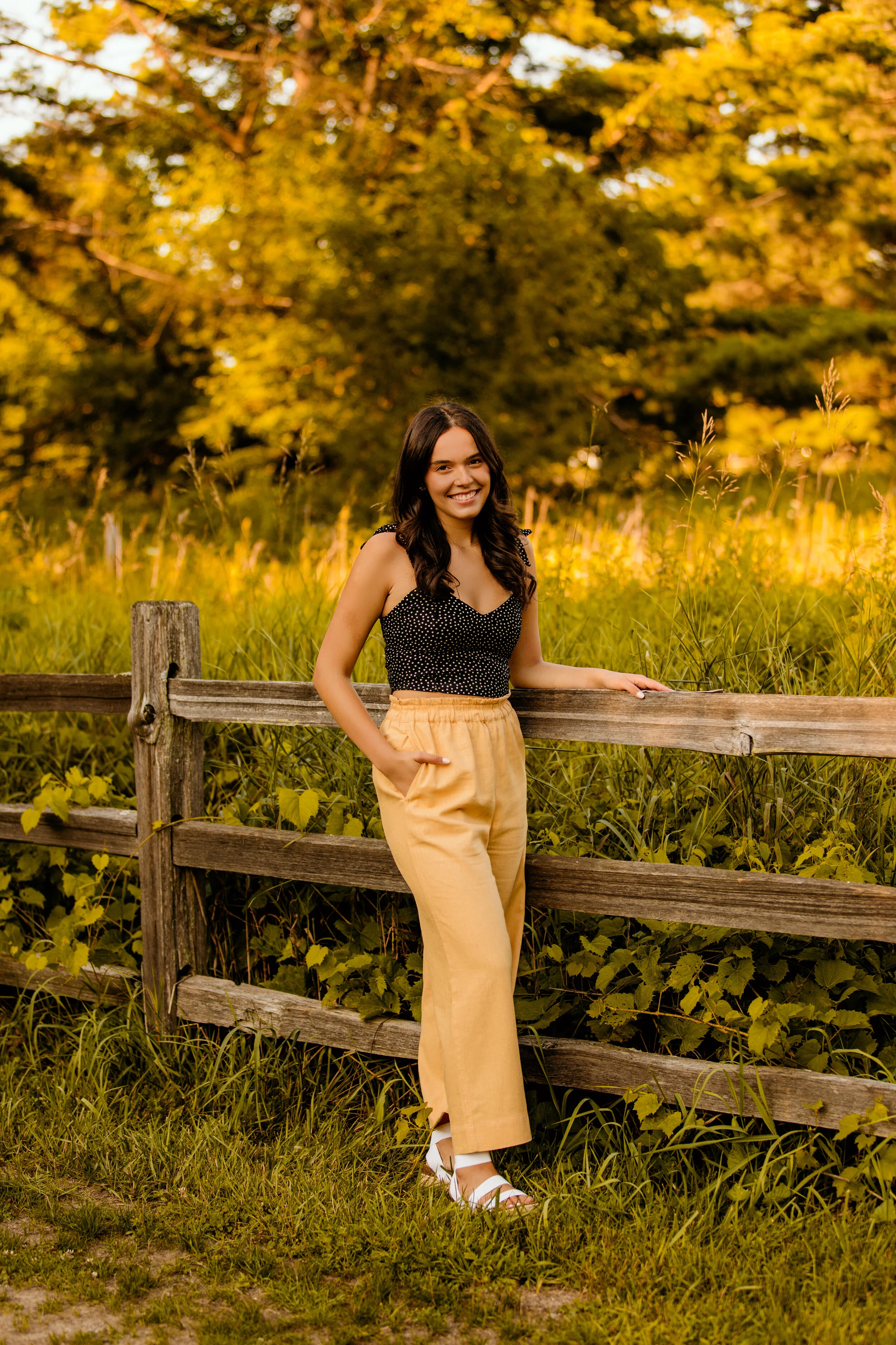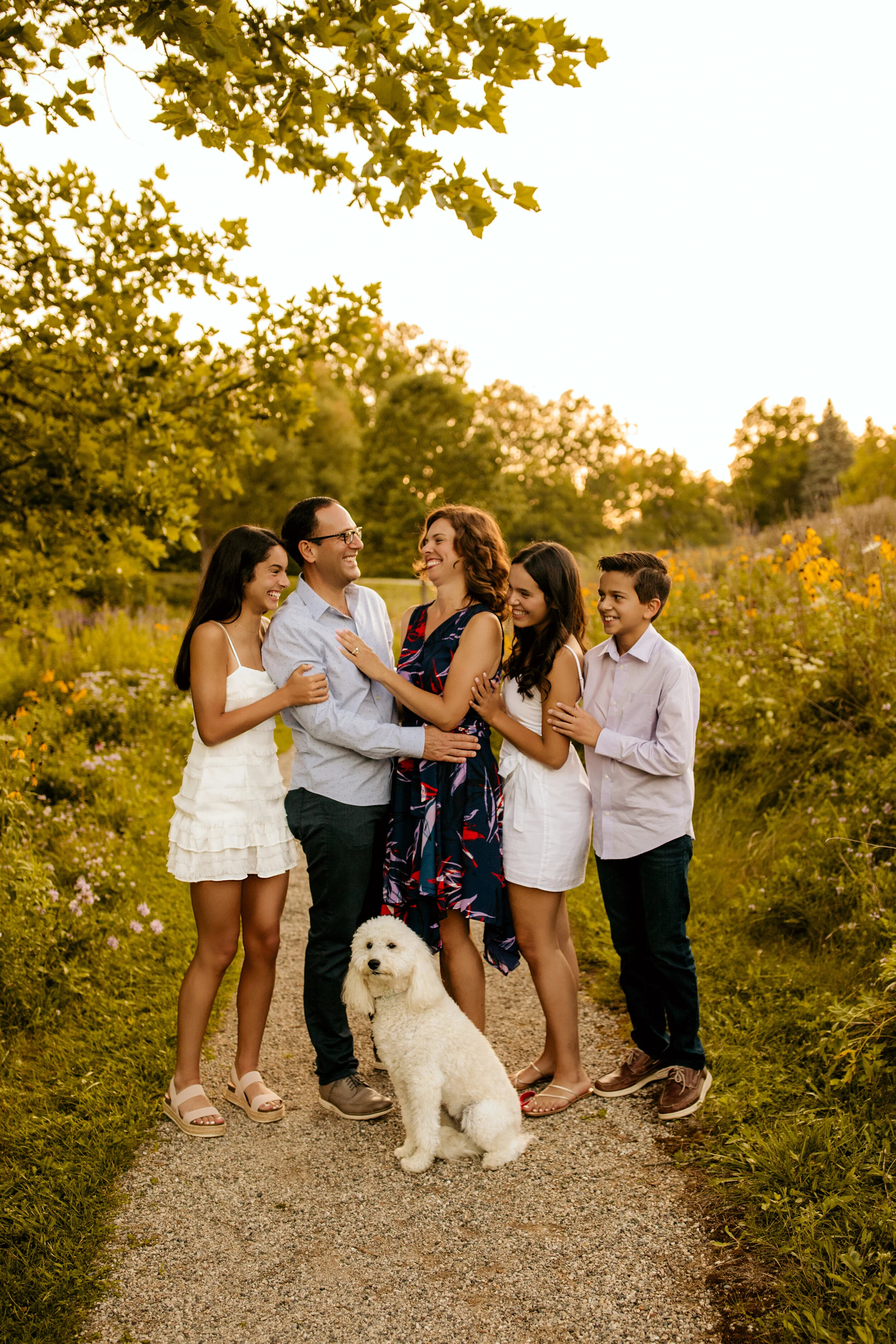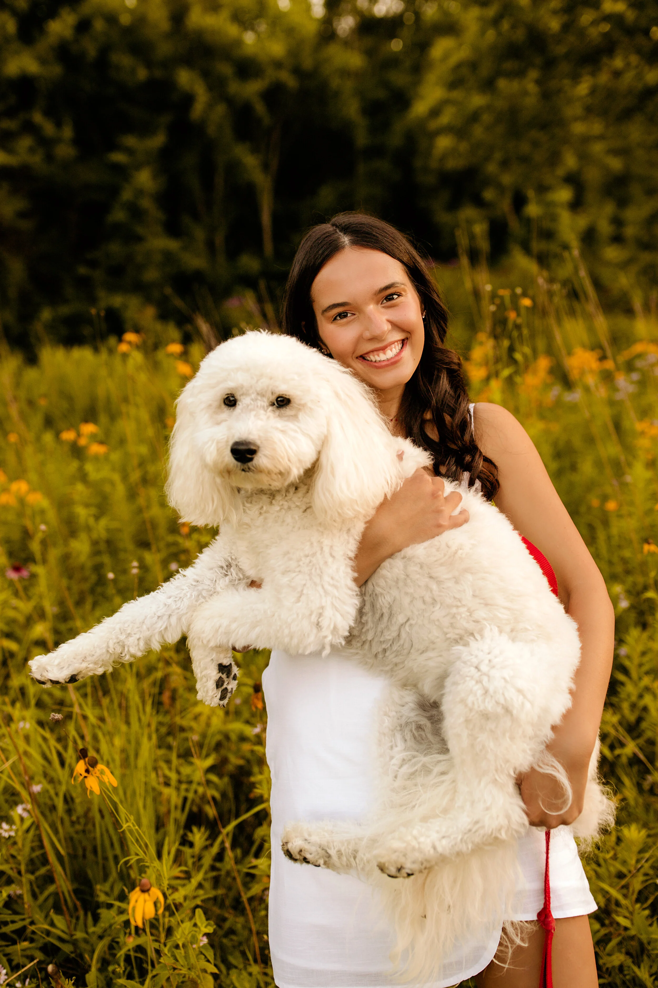 We started off in a beautiful grassy nature setting in Shelby Township. Wildflowers are always blooming late July and early August, so she got to include the gorgeous wildflowers in her photos! I love that she did a dressy and casual outfit at this location because it gives off two different vibes, which is great to get a variety of pictures. After the first location we headed to the second location in Rochester Hills which has a beautiful pond, bridges, and more stunning scenery! Oakland County has so many pretty hidden gems! Rachel did another casual and dressy outfit at this location, which was perfect! She even threw on a T-shirt for the college she’s attending to add an even more personal touch to her photos! At the very end of her senior session, the rest of her family met up with us for a few updated family photos! Even her adorable dog tagged along!!