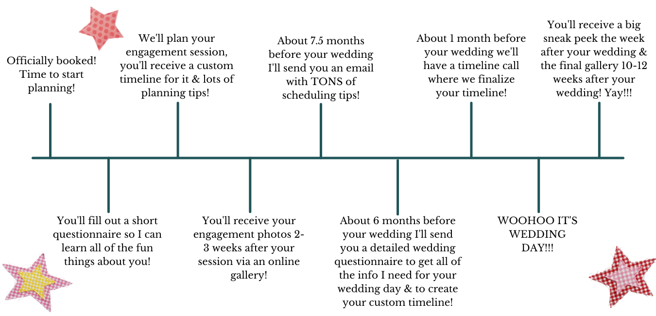 I’m going to email you an extremely detailed wedding questionnaire about 5 months before your wedding that will help me capture your favorite day exactly as you’ve always dreamed! It will also give me all of the information I need to create your customized timeline! I will create a couple different timeline variations for you and we will go over them together to see which one you like best! If you’d like to do any of this sooner, just reach out any time and we absolutely can!
